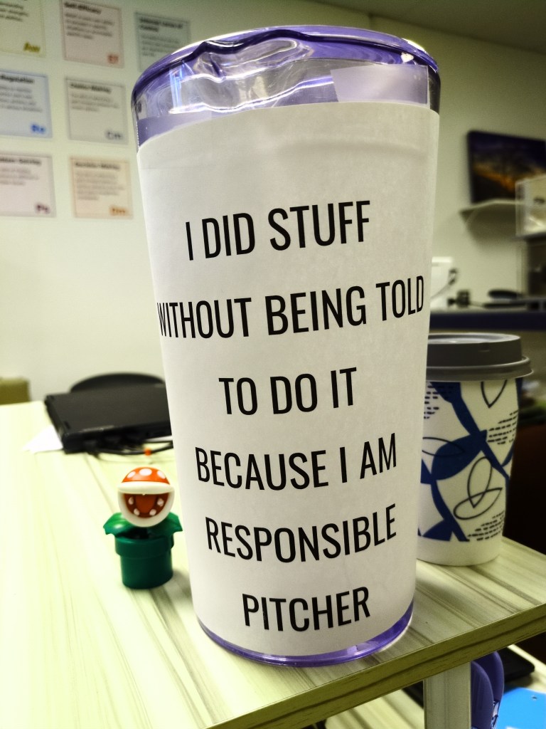 Being responsible and self motivated are two key attributes of a great employee. In the training room, our interns have an opportunity to sharpen these skills. They are required to clean the training room each Thursday and if they remember to do it WITHOUT being asked they can put their name in the “Pitch In Pitcher.”